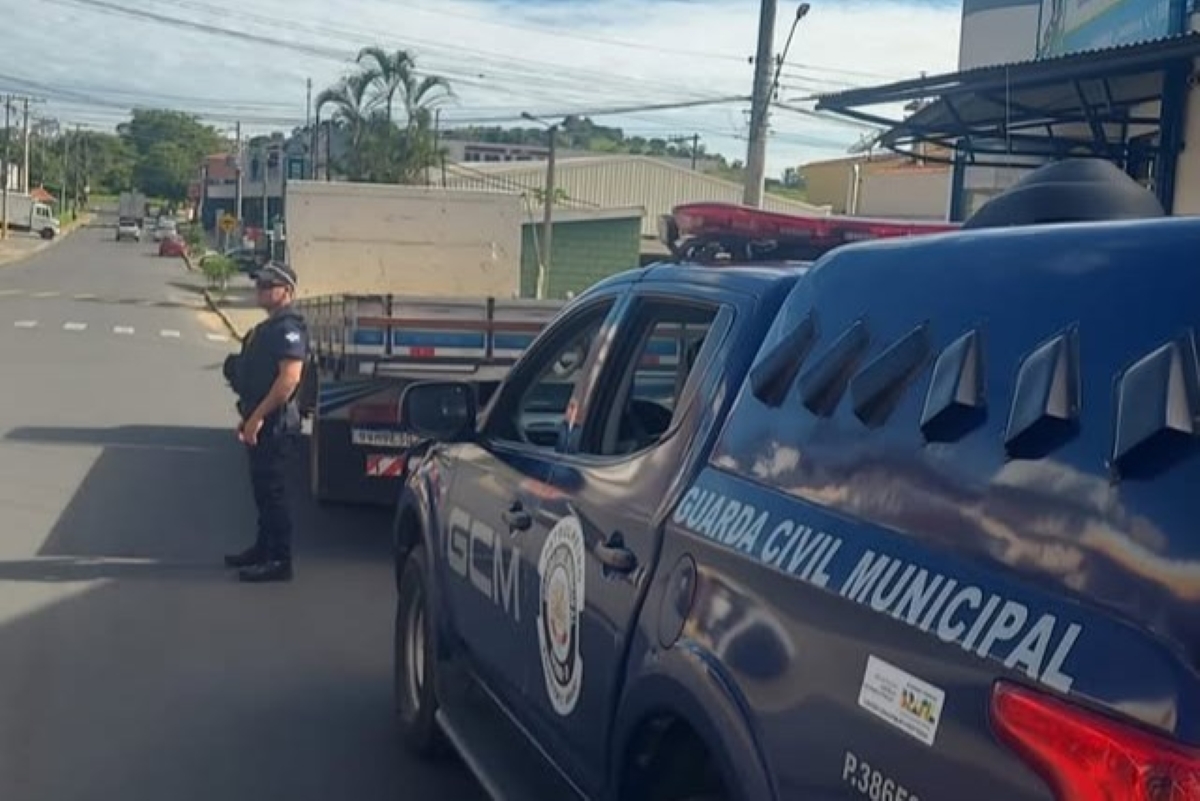 Imagem colorida de caminhão e viatura da GCM. Metrópoles