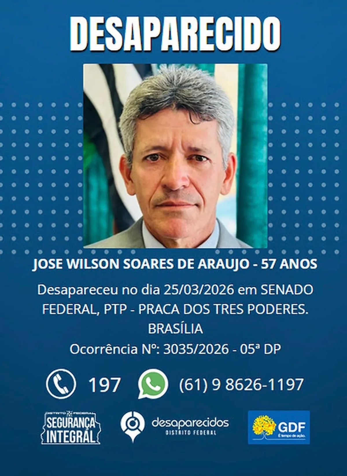 Quem tiver qualquer informação sobre José Wilson deve ligar para o número 197 ou no telefone (61) 98626-1197, da Polícia Civil do Distrito Federal.