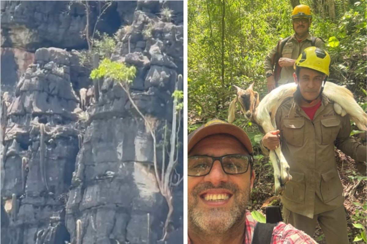 Um bode preso a cerca de 120 metros de altura em um despenhadeiro no Parque Estadual da Terra Ronca, em São Domingos (GO), mobilizou equipes do Corpo de Bombeiros, na última sexta-feira (2/1). O animal foi resgatado sem ferimentos aparentes, mas bastante debilitado, devido ao tempo prolongado em que permaneceu preso no local.
