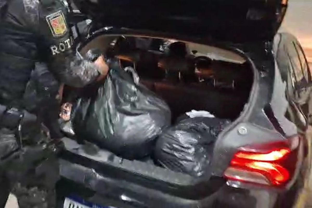 Os policiais militares estavam em patrulhamento quando suspeitaram de um motorista que dirigia em alta velocidade e realizava manobras perigosas. Diante da situação, decidiram fazer a abordagem. Assim que se aproximaram do veículo, as equipes notaram diversos pacotes no interior do automóvel.