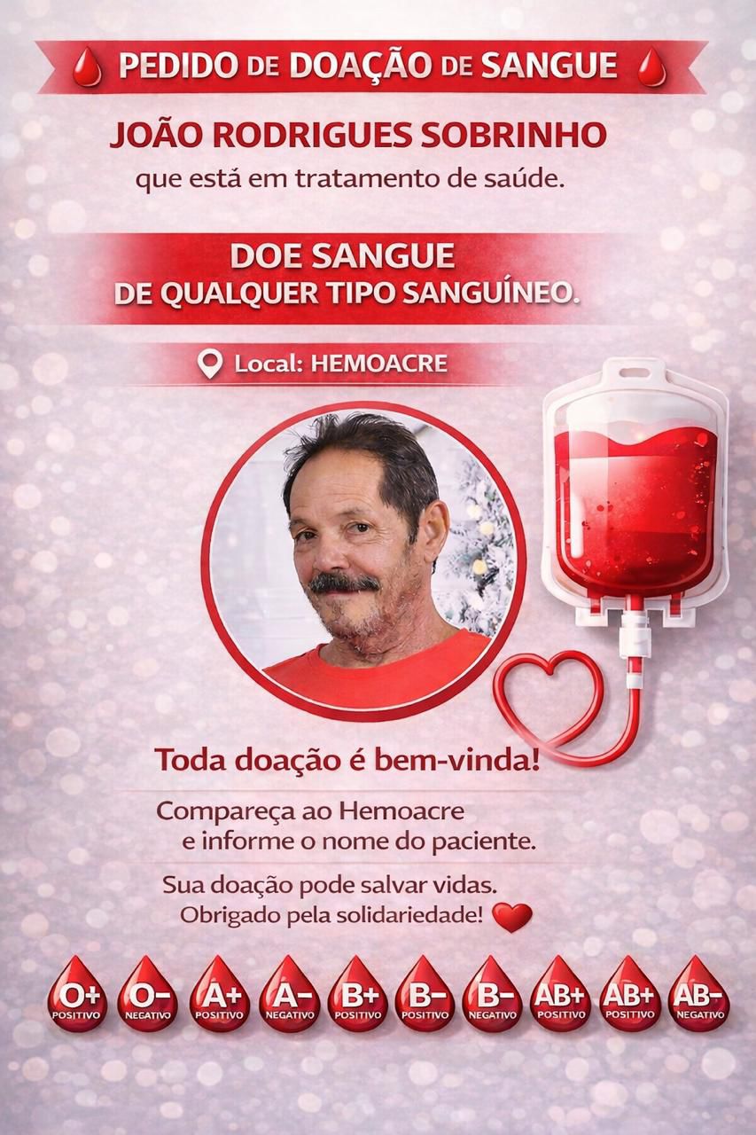 A família de João Rodrigues Sobrinho faz um apelo à população por doações de sangue. O paciente está em tratamento de saúde na Unacon, em Rio Branco, onde enfrenta um…