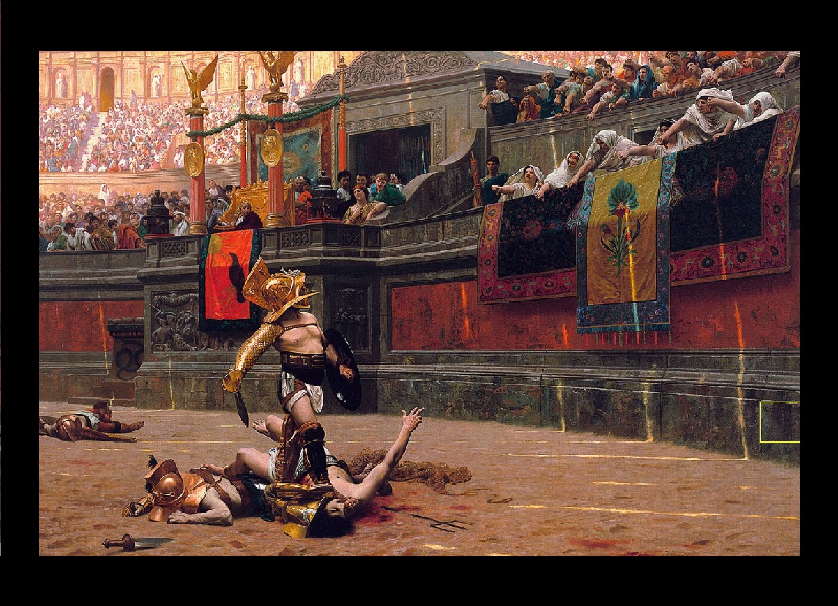 Nota: essa conversa de “polegar-para-cima-vive-e-para-baixo-morre” é papo-furado. É uma distorção que o quadro “Pollice Verso”, de 1872, de Jean-Léon Gérôme, que ilustra este texto, ajudou a consolidar. Na verdade, o polegar para cima é que representava a torcida pela morte; a pela vida era traduzida pelo dedo recolhido. Mas isso fica para outra hora.