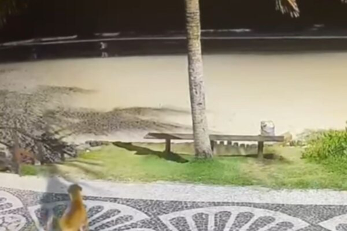 Um homem surge na cena e se senta a um banco enquanto observa a ação dos adolescentes. Pouco depois, os menores suspeitos saem pela faixa de areia com o cachorro. O material está sendo analisado pela polícia.