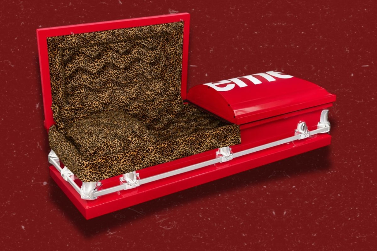 A Supreme, grife conhecida pelos produtos polêmicos e cheios de hype, acaba de lançar um caixão funcional estampado com o logotipo da marca. Com interior forrado com animal print de onça, o item fúnebre já teve todas as suas unidades vendidas, com valor de R$ 20 mil cada.