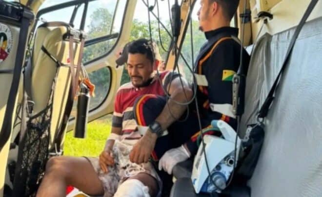 O helicóptero do Centro Integrado de Operações Aéreas (CIOPAER), baseado em Cruzeiro do Sul, realizou um resgate que salvou a vida de José Costa da Silva, de 40 anos, vítima de um acidente com motosserra no rio Juruá Mirim. O homem sofreu um corte profundo no joelho durante o trabalho com madeira, causando hemorragia que colocava sua vida em risco.