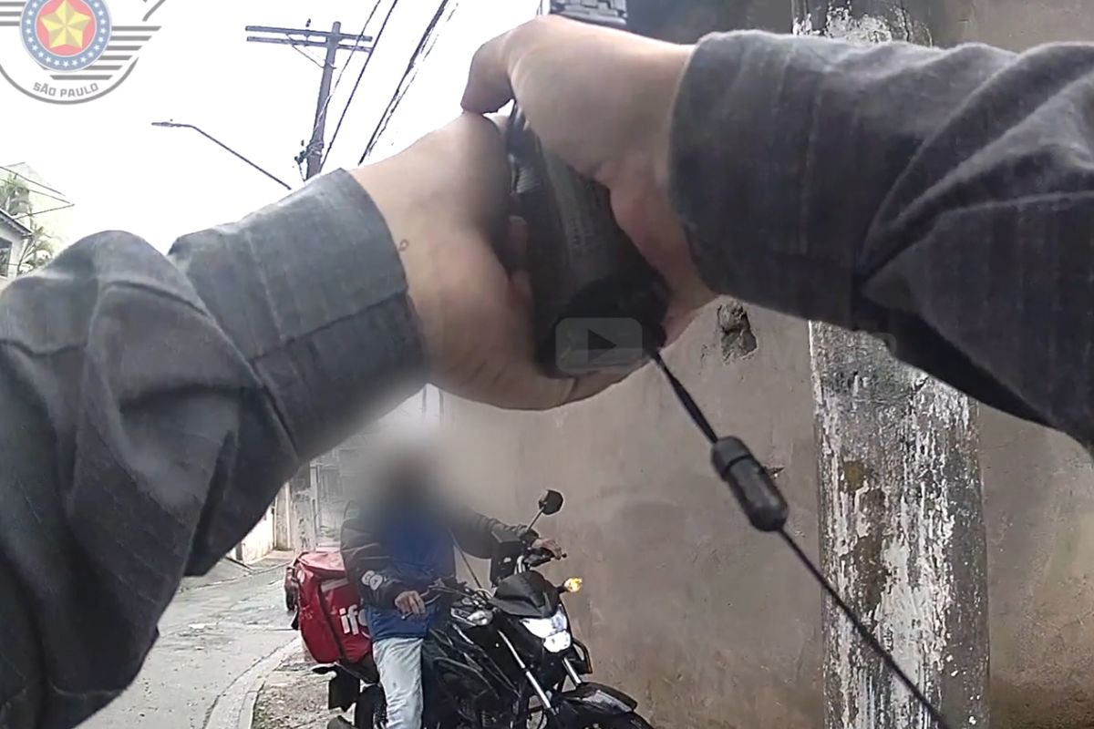 Nas imagens registradas pelas câmeras corporais dos policiais militares, é possível ver o momento em que o suspeito é abordado na rua. O homem aparece conduzindo uma motocicleta, com uma bolsa de entregas presa na parte traseira do veículo, quando é interceptado pelos PMs. Durante a abordagem, os policiais ordenam que ele desça da moto e coloque as mãos na cabeça. O suspeito não reage à ação policial e segue as orientações dadas pela equipe.