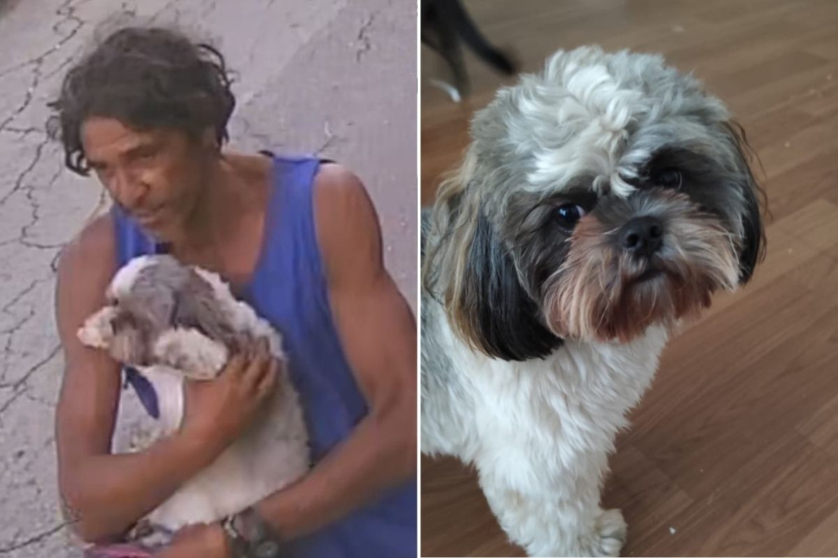 Câmeras de segurança flagraram o crime (veja acima). Nas imagens, é possível observar o homem se aproximando da residência. Ele parece interagir com o animal e se senta na calçada. Após alguns minutos, o homem levanta, retira o pet pelo portão e foge com ele no colo. O suspeito foi visto caminhando com o animal em diferentes pontos da região.