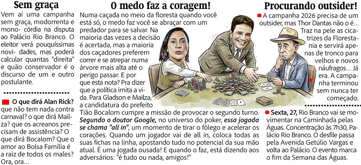 A campanha 2026 precisava de um arco-íris, mas será monocromática. Como diria a infindável Baby (Consuelo): “tuuuudo azuuuul”… Se não, vejamos: o Republicanos é azul, o PP é azul e o PSDB é azul. Não demora e o exigente eleitor acreano vai jogar tinta no ventilador.