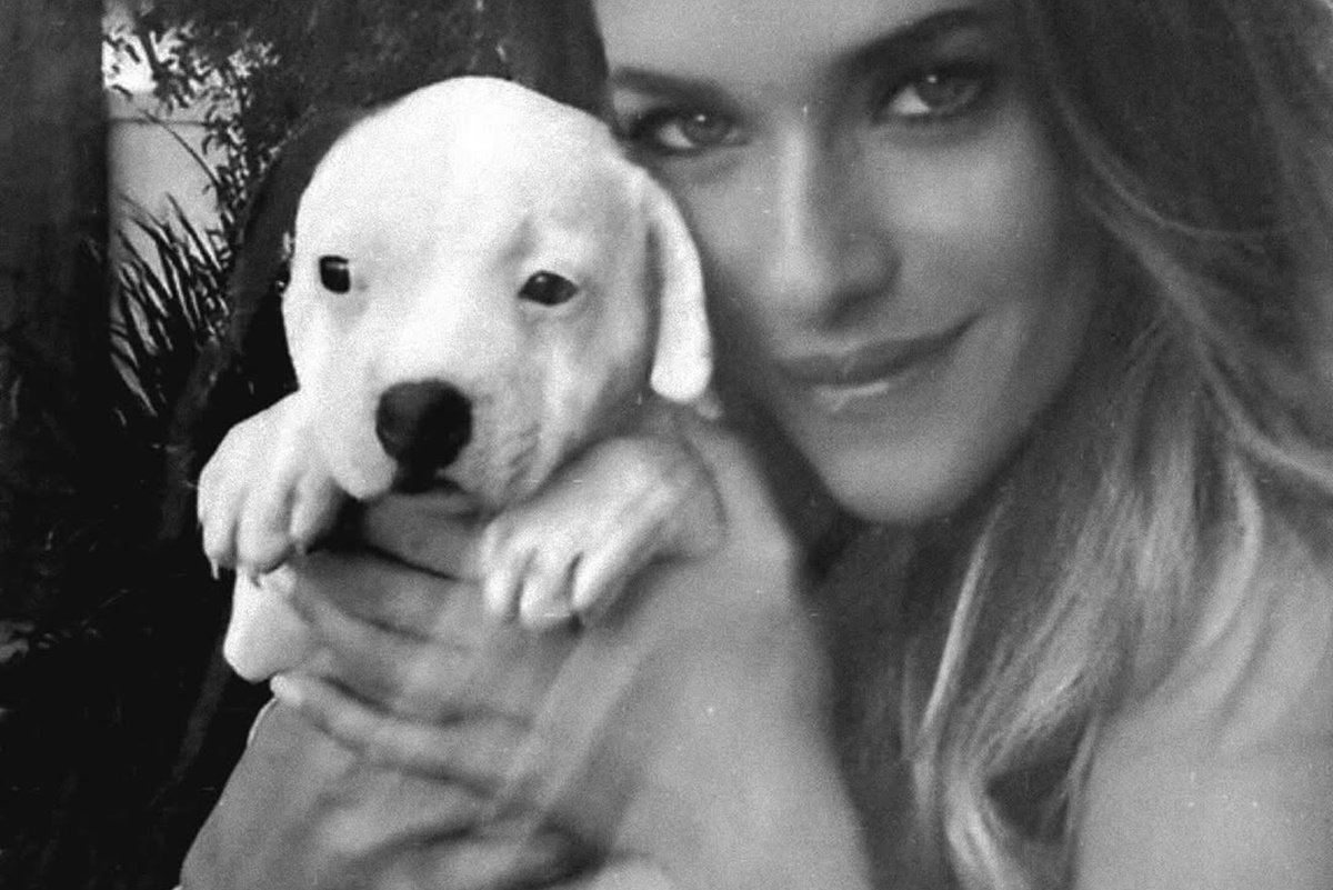 Na postagem, a staffordshire terrier aparece ainda filhote e anos depois em cliques em preto e branco ao lado da dona.
