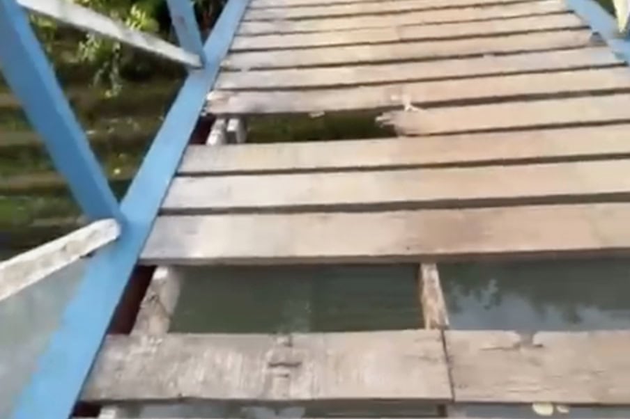 No registro, uma moradora mostra partes da ponte danificadas e afirma que o problema representa risco para pedestres que utilizam a passagem diariamente.