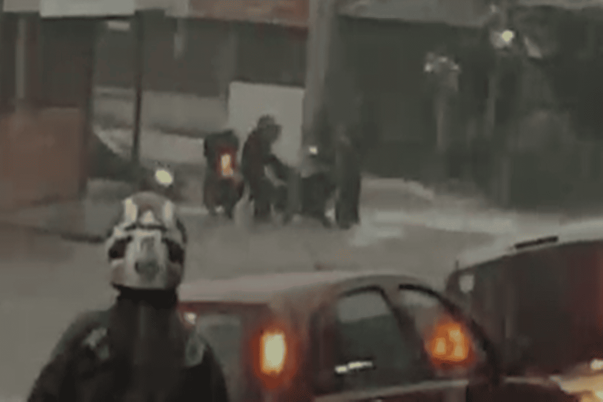 O condutor só não foi levado pela correnteza porque dois homens que estavam próximos perceberam a situação e correram para ajudá-lo. Eles seguram a motocicleta e auxiliam o motociclista a sair do trecho mais crítico.