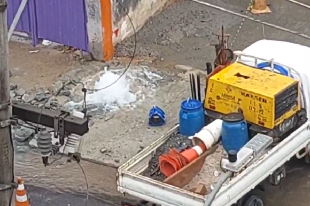 No vídeo publicado nas redes sociais, é possível ver a água sendo jorrada em uma calçada na área de obras. Na publicação, o morador ainda alega que a situação já vinha ocorrendo havia quase três horas.