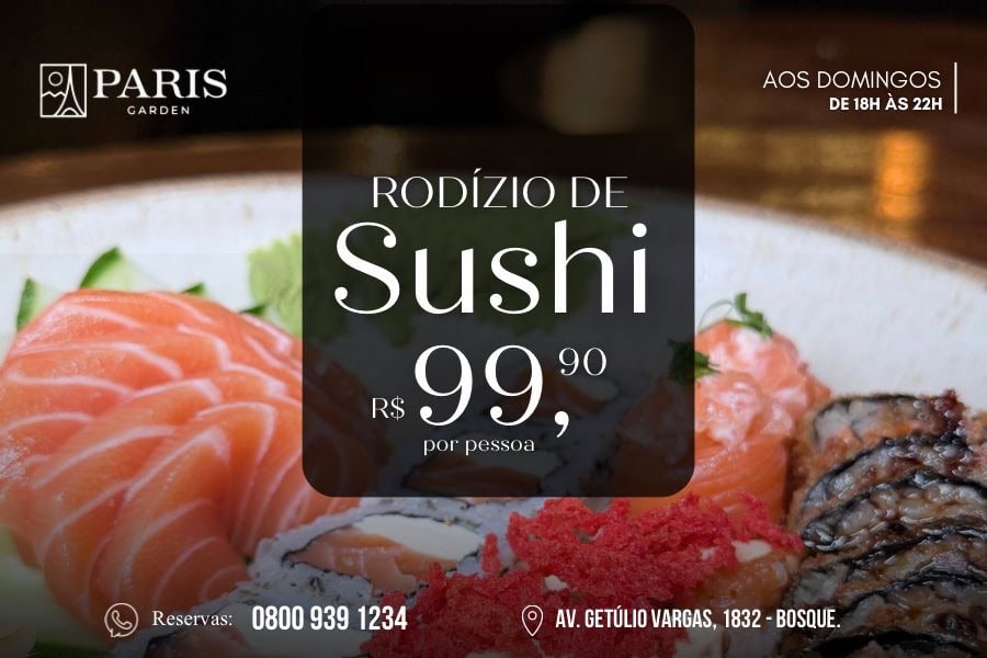 O restaurante Paris Garden realiza neste domingo (29) mais uma edição do rodízio de sushi, com funcionamento das 18h às 22h, no valor de R$ 99,90 por pessoa. O evento ocorre todos os domingos e inclui variedade de peças de sushi frescos. A unidade fica localizada na Avenida Getúlio Vargas, 1832, no bairro Bosque, em […]