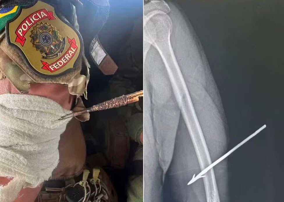 Na unidade de saúde, exames apontaram que a flecha atravessou o braço esquerdo do policial e ficou alojada no osso. Apesar da gravidade do ferimento, ele apresentava quadro estável e sem sinais de choque. O agente foi encaminhado para avaliação cirúrgica para retirada do objeto e permanece internado sob cuidados médicos.