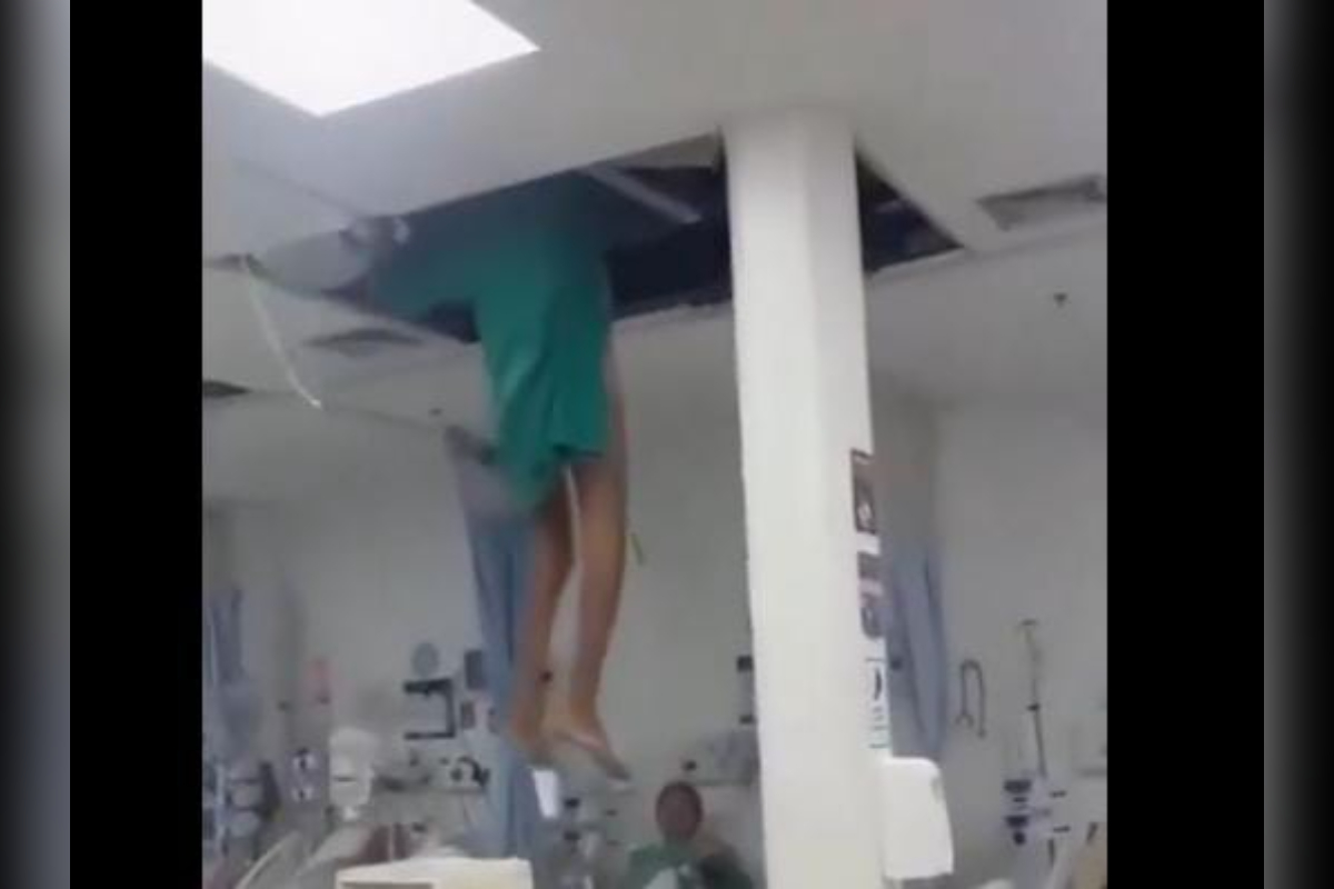 Um vídeo que viralizou nas redes sociais mostra o paciente vestindo roupas hospitalares e caindo do forro, dentro da sala de internação. Segundo o hospital, o homem era usuário de drogas e estava em surto no momento da tentativa de fuga.