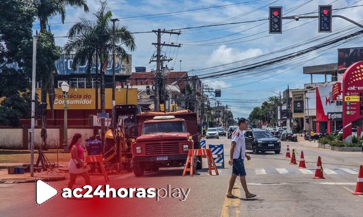 Parte da Avenida Ceará, na região central de Rio Branco, em frente ao Terminal Urbano, foi interditada na manhã desta quinta-feira, 19, após rompimento na rede de água.