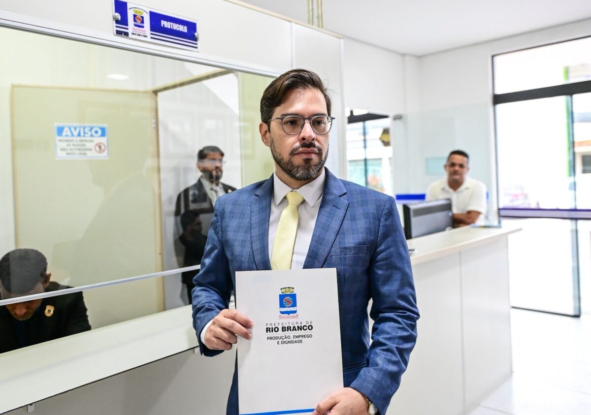O secretário Jorge Eduardo, titular da Secretaria Especial de Assuntos Jurídicos e Atos Oficiais (Sejur), esteve na Câmara Municipal de Rio Branco nesta quinta-feira, 26, para entregar a carta de renúncia do prefeito Tião Bocalom (PSDB).
