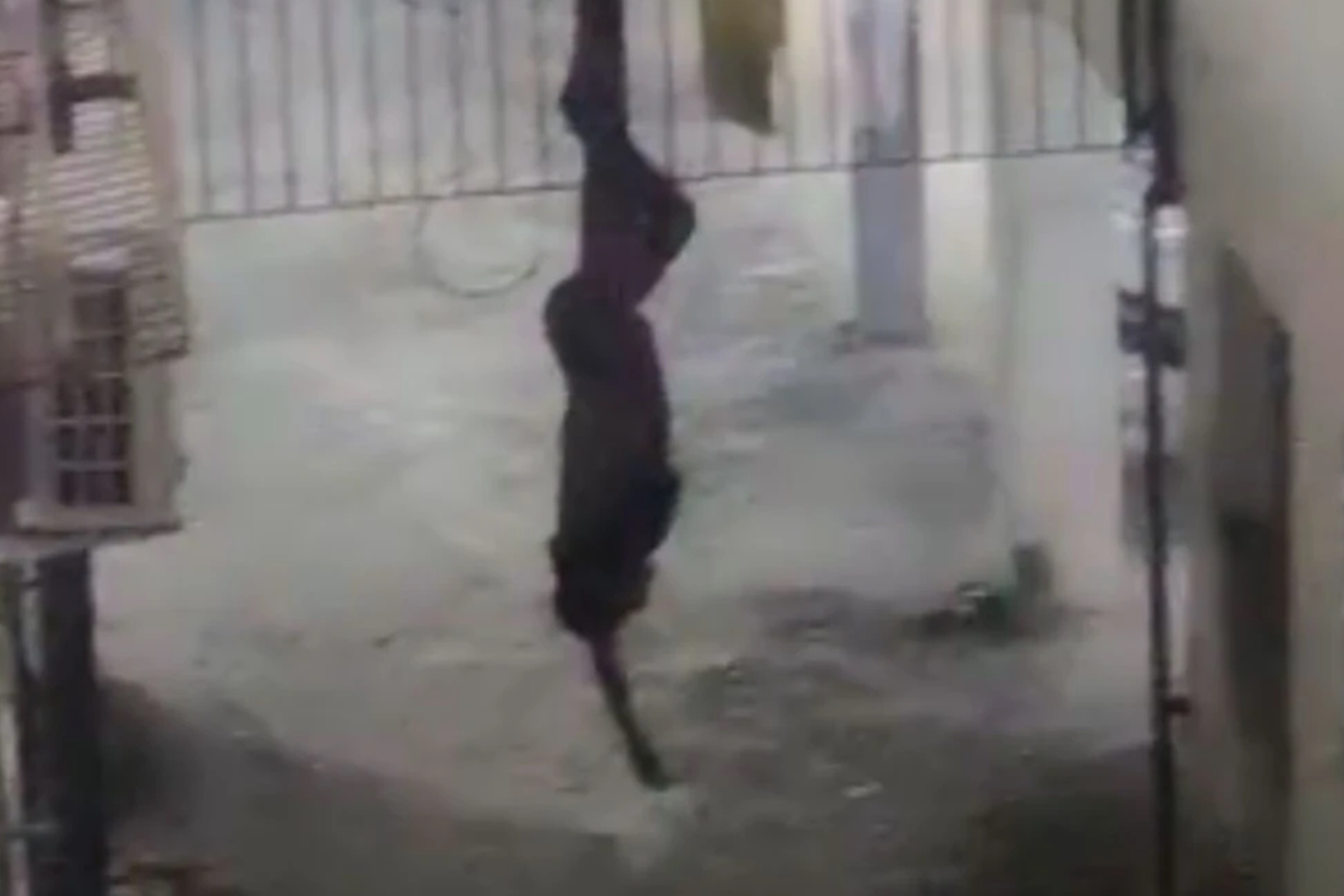 Homem foi localizado pelos policiais preso na grade do portão, de cabeça para baixo e precisou ser resgatado pelo Corpo de Bombeiros