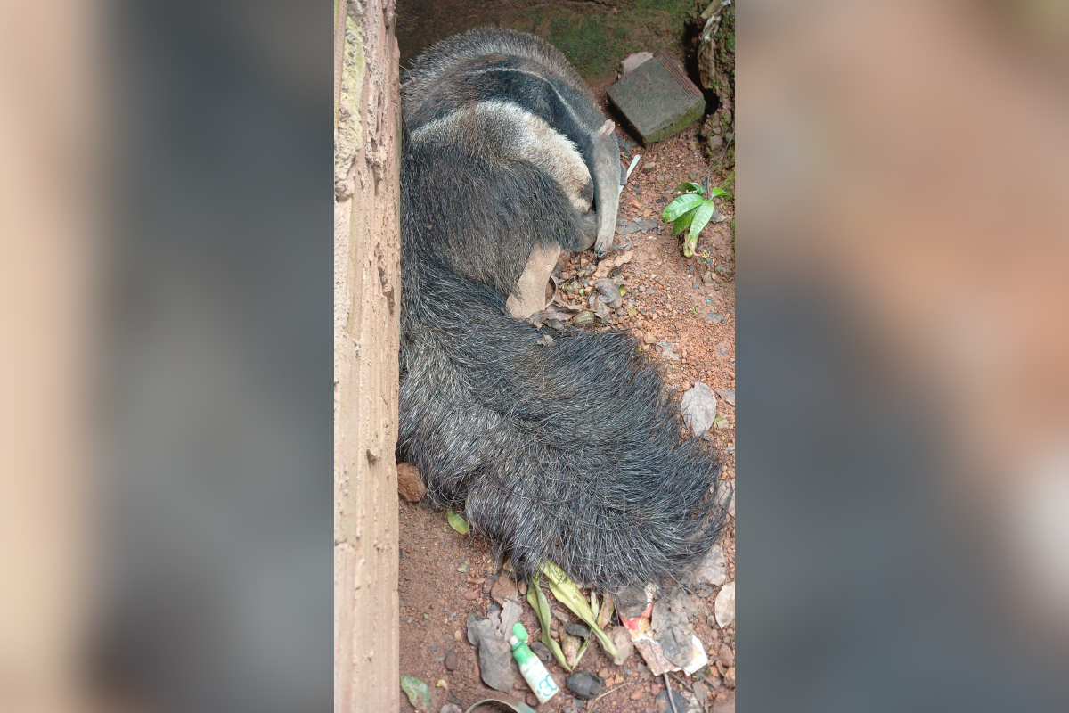 A equipe policial foi acionada por volta das 11h30 para atender a uma ocorrência de resgate de animal silvestre. O tamanduá estava dentro da residência e apresentava ferimentos.
