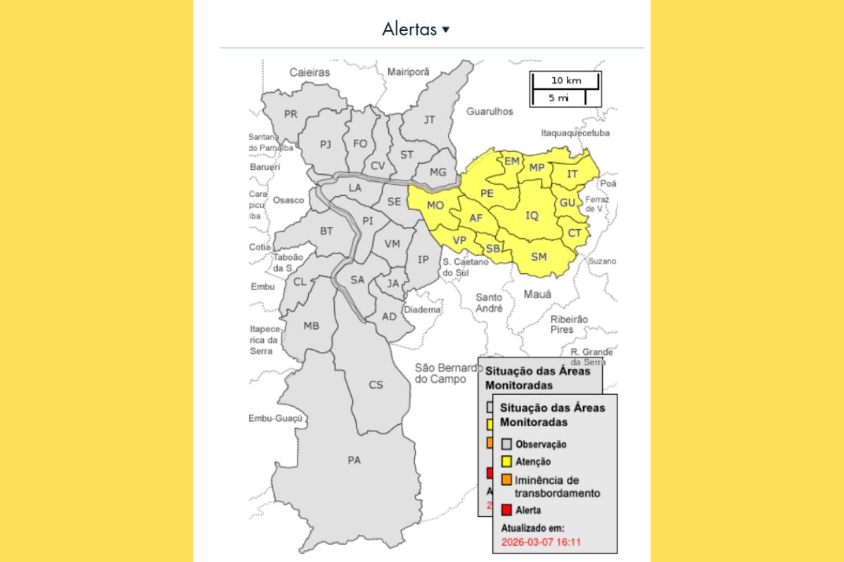 Segundo o órgão municipal, a cidade já havia amanhecido em estado de atenção para alagamentos, em alerta que era válido para as zonas norte, leste e oeste, além da Marginal Tietê.