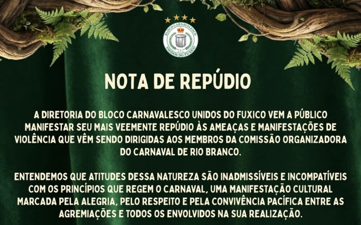 “A Diretoria do Bloco Carnavalesco Unidos do Fuxico vem a público manifestar seu mais veemente repúdio às ameaças e manifestações de violência que vêm sendo dirigidas aos membros da Comissão Organizadora do Carnaval de Rio Branco”, diz trecho da nota.
