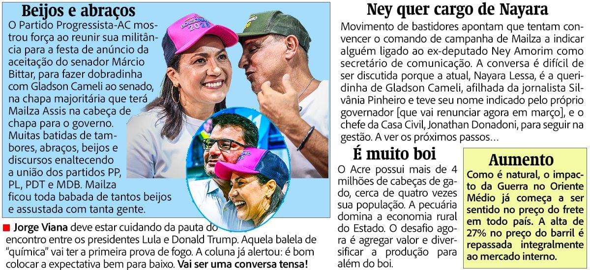 O clima político na capital acreana não anda dos mais harmônicos. Informações de bastidores indicam que o senador Marcio Bittar e o prefeito Tião Bocalom estariam enfrentando divergências longe das câmeras. A especulação é de que o racha pode refletir diretamente na estrutura administrativa, com possibilidade de mudanças e exonerações de indicados ligados ao grupo político. Nos corredores, comenta-se que a falta de alinhamento em torno de apoios eleitorais pode acelerar decisões.