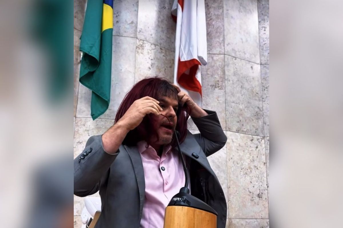 O vereador Adrilles Jorge (União) passou batom e vestiu uma peruca na Câmara Municipal de São Paulo para criticar a proposta aprovada pelo Senado Federal nessa terça-feira (24/3) que classifica misoginia, o ódio contra mulheres, como crime de preconceito previsto na Lei do Racismo.