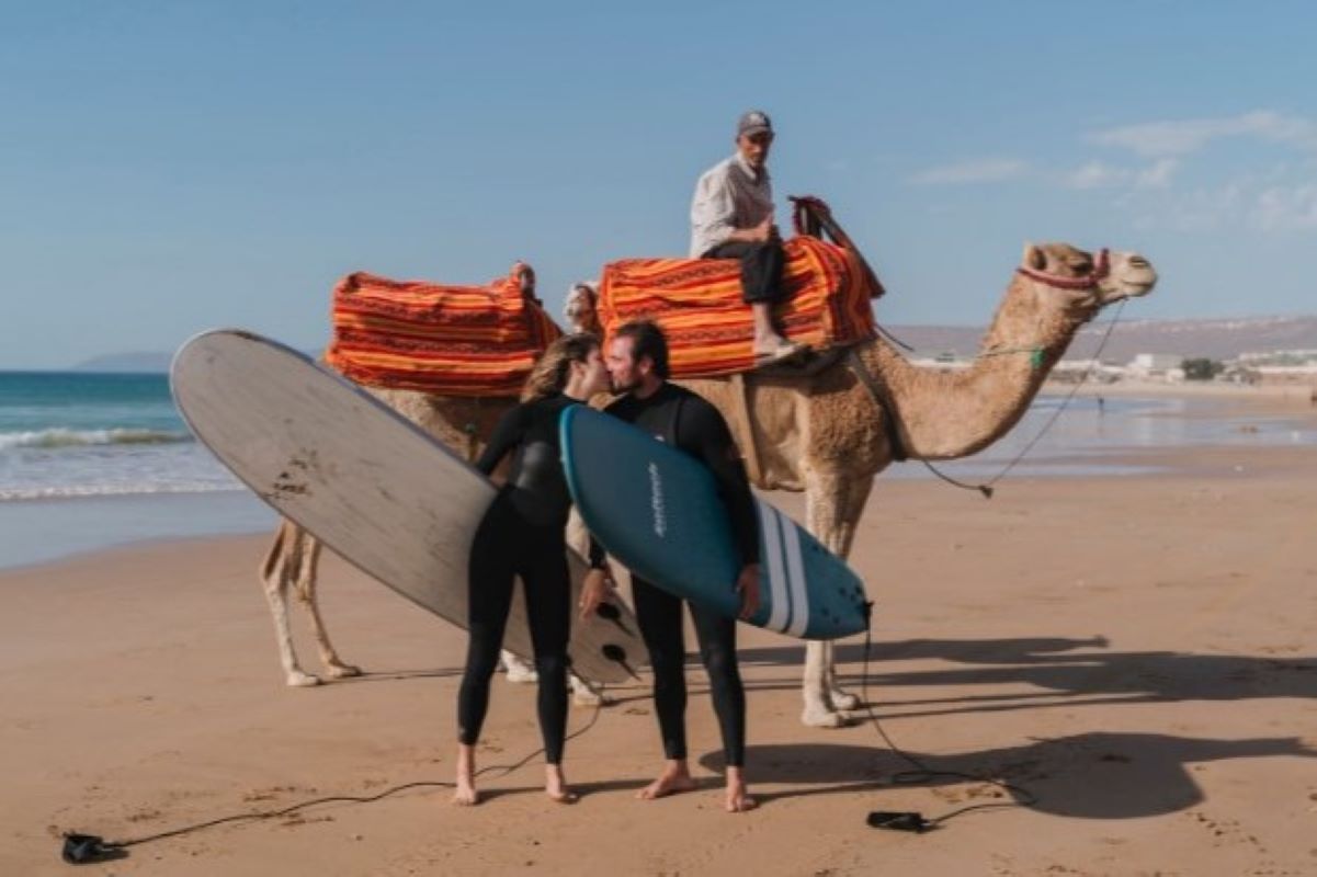 Antes do momento do sim na Itália, ambos ainda passaram por Marrocos, onde Vorcaro fez aulas de surf. Uma das imagens mostra o casal se beijando, com pranchas de surf nos braços, e um camelo no fundo.