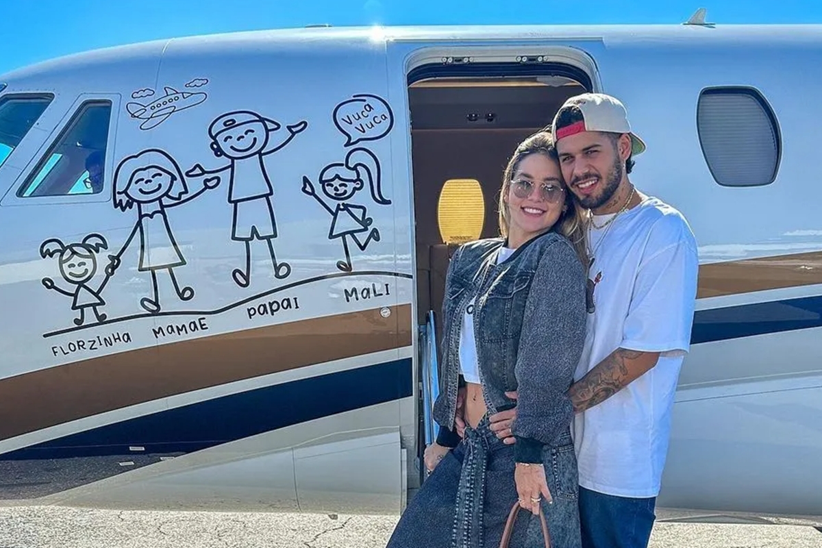 A aeronave utilizada foi adquirida quando Zé Felipe e Virginia ainda eram casados e ainda mantém adesivos que ilustram a família, com desenhos do cantor, da influenciadora e dos três filhos: Maria Alice, Maria Flor e José Leonardo. Zé Felipe decolou de Goiânia na tarde deste sábado (10/1) com destino a Balneário Rincão, em Santa Catarina, onde tem apresentação confirmada. Enquanto isso, a empresária está em viagem a Dubai.
